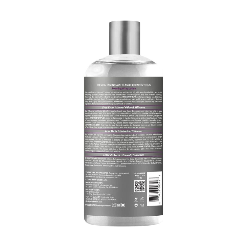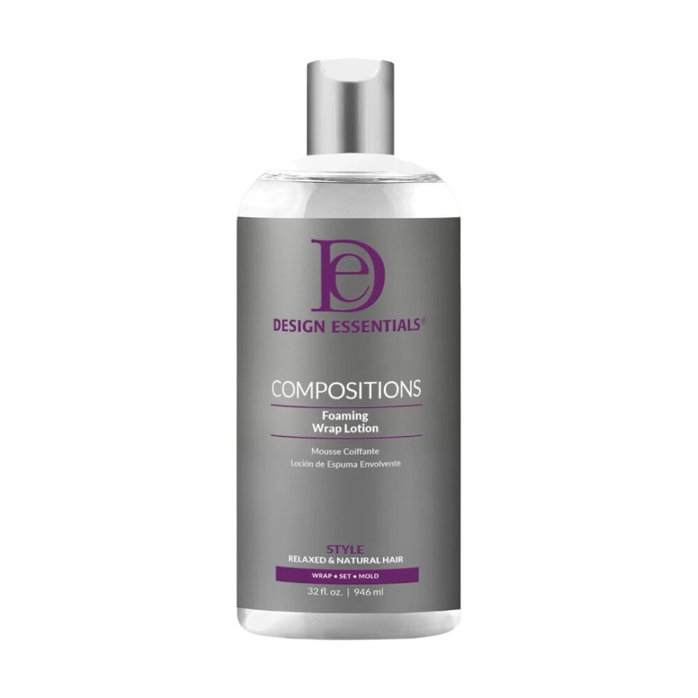 De Design Essentials Compositions Foaming Wrap Lotion is een lichte, schuimende stylinglotion die specifiek is ontworpen om het haar te verstevigen, te conditioneren en te beschermen tijdens het zetten van wrap-styles, roller sets en andere stijlen die een sterke, pluisvrije hold vereisen.