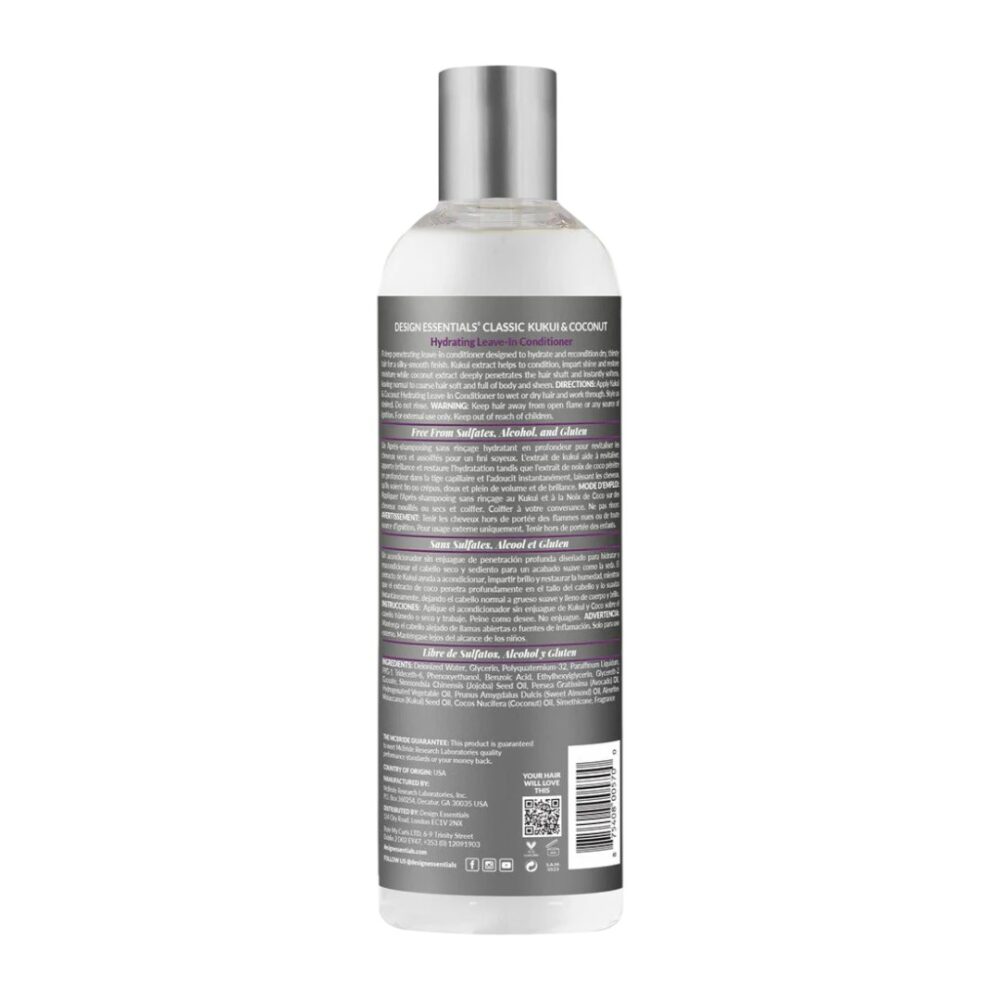 De Design Essentials Kukui & Coconut Hydrating Leave-In Conditioner is een lichte, vochtinbrengende spray-conditioner die is ontworpen om het haar onmiddellijk te hydrateren, te ontwarren en te beschermen, met de exotische voordelen van Kukui en Kokosnoot.